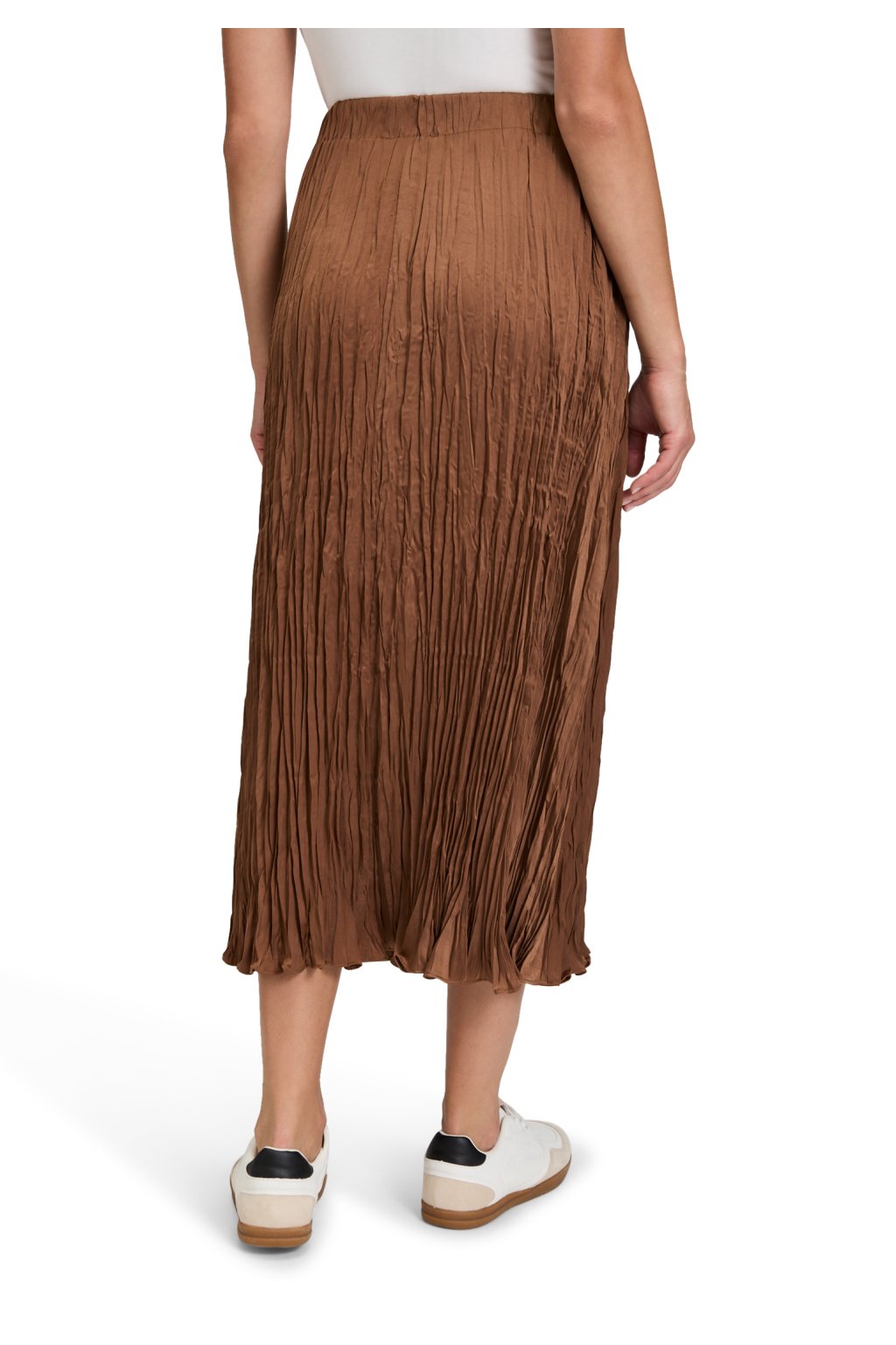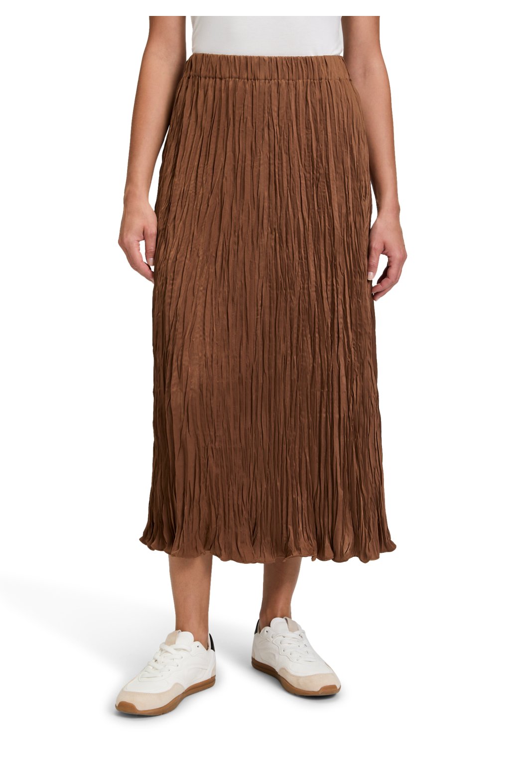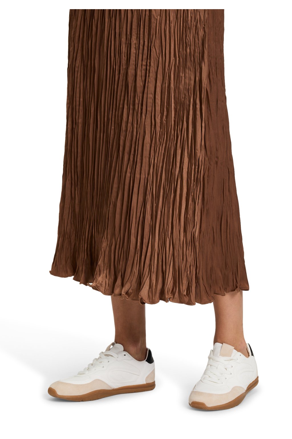 Elegantní plisovaná sukně Betty Barclay v hnědém odstínu nugát s pohodlným elastickým pasem na gumu. Jemný lesk a vzdušný střih podtrhnou ženskost. Skvěle se kombinuje s jednobarevnými halenkami či úpletovými roláky.