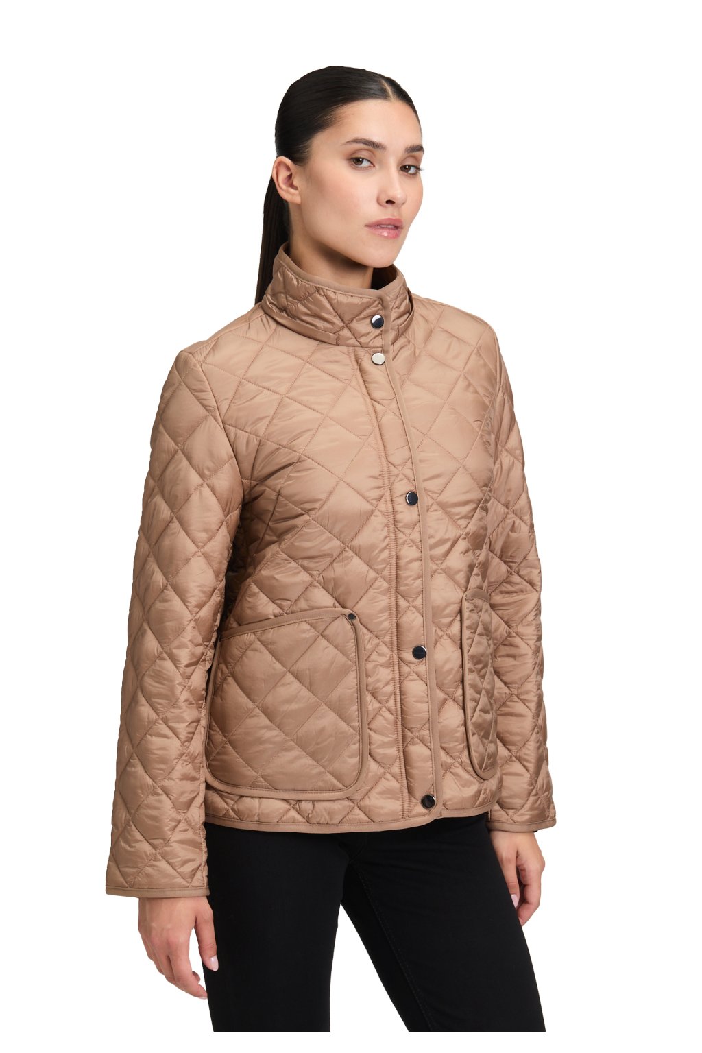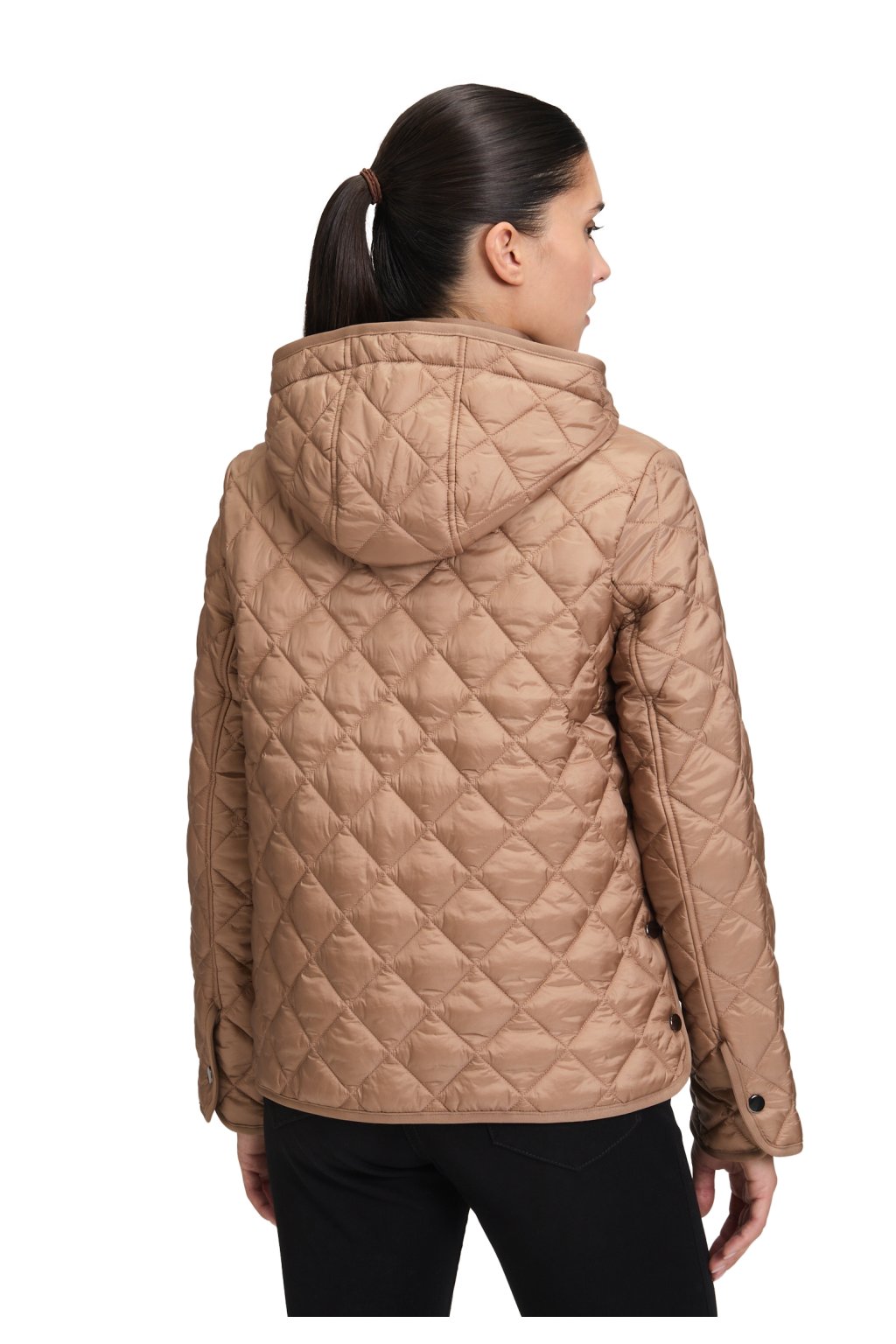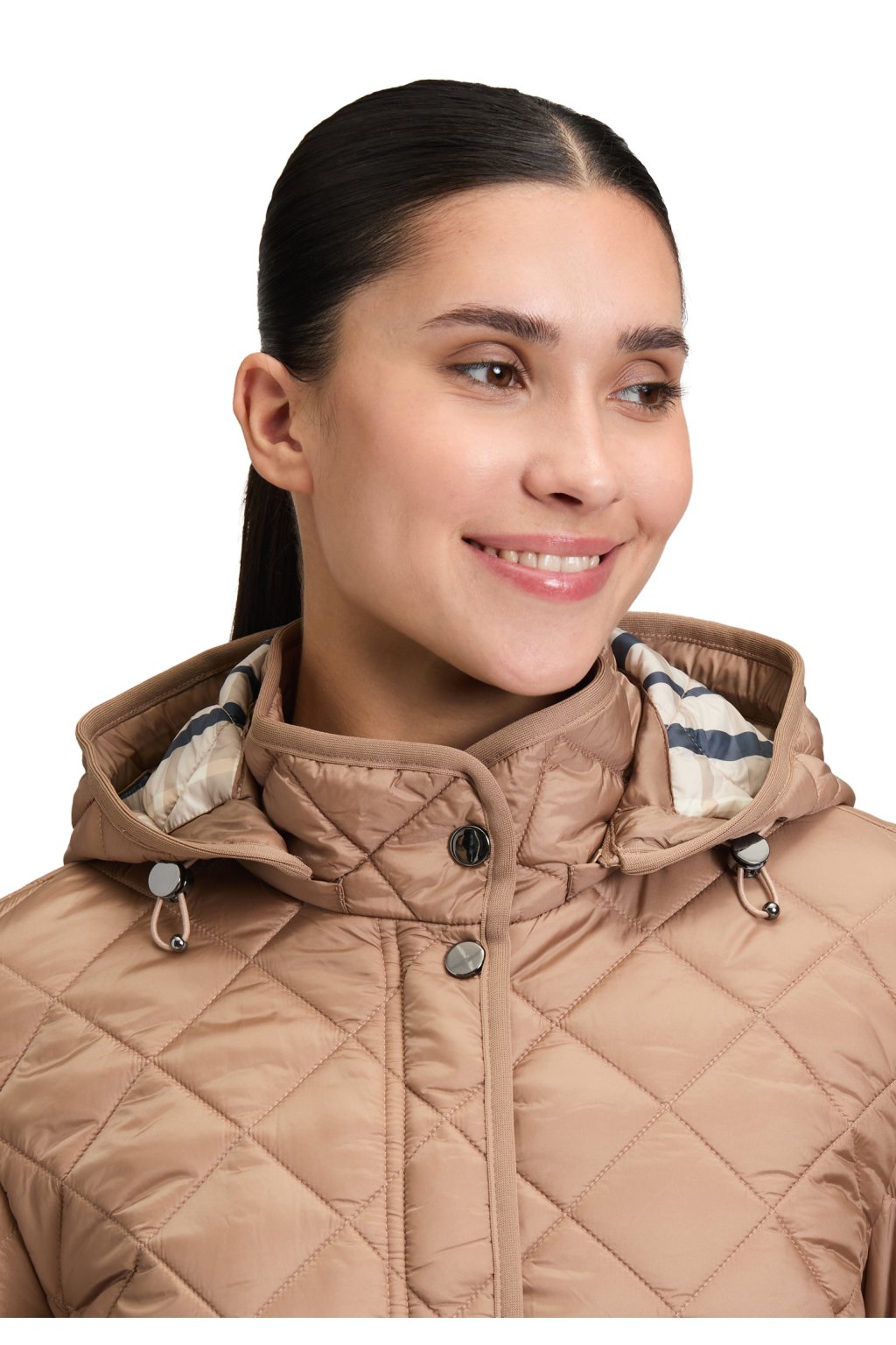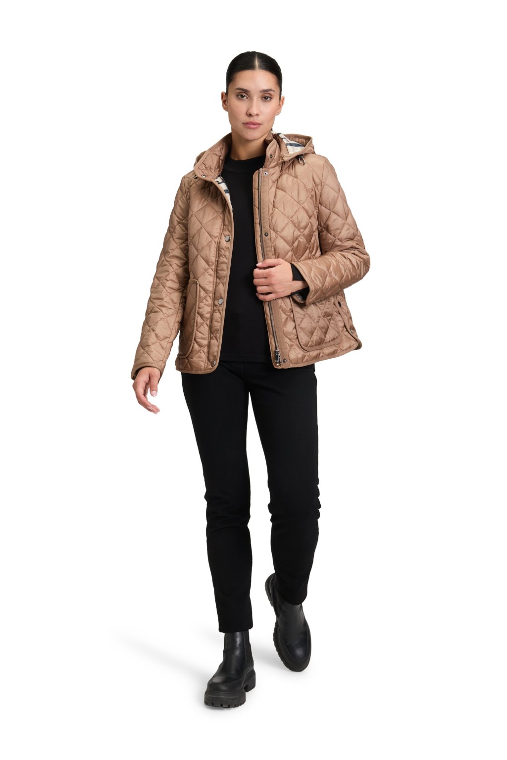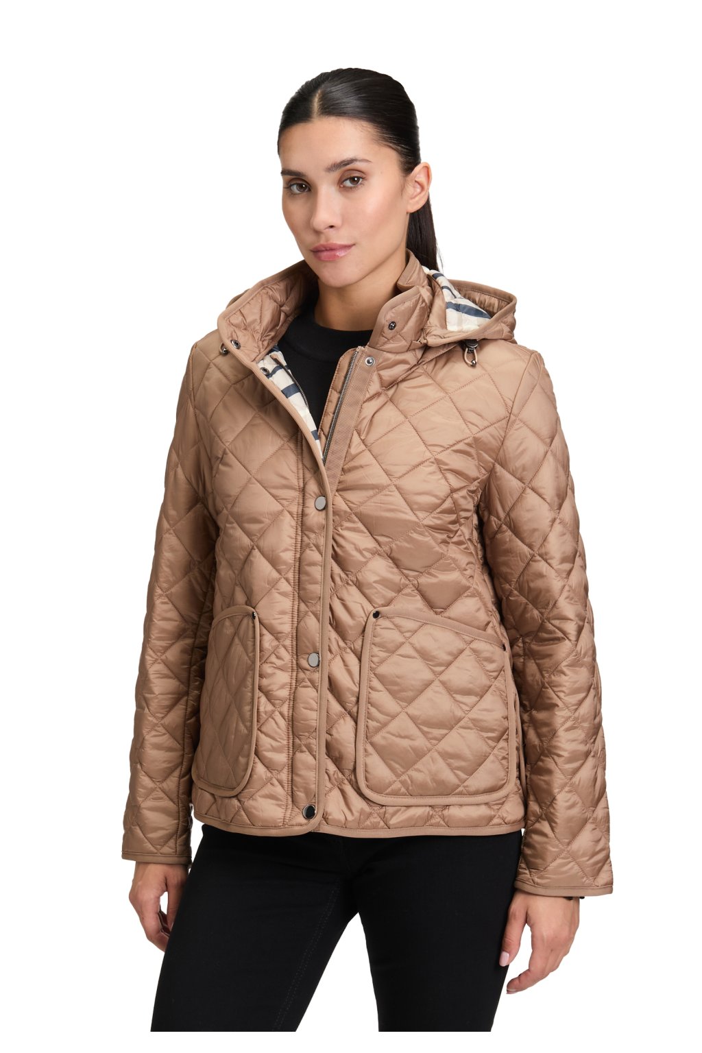 Přechodná prošívaná bunda Betty Barclay v teplém světle hnědém odstínu chanterelle s odnímatelnou kapucí a kostkovanou podšívkou. Praktické našité kapsy oceníte každý den. Ideální k džínám i úpletovým šatům.