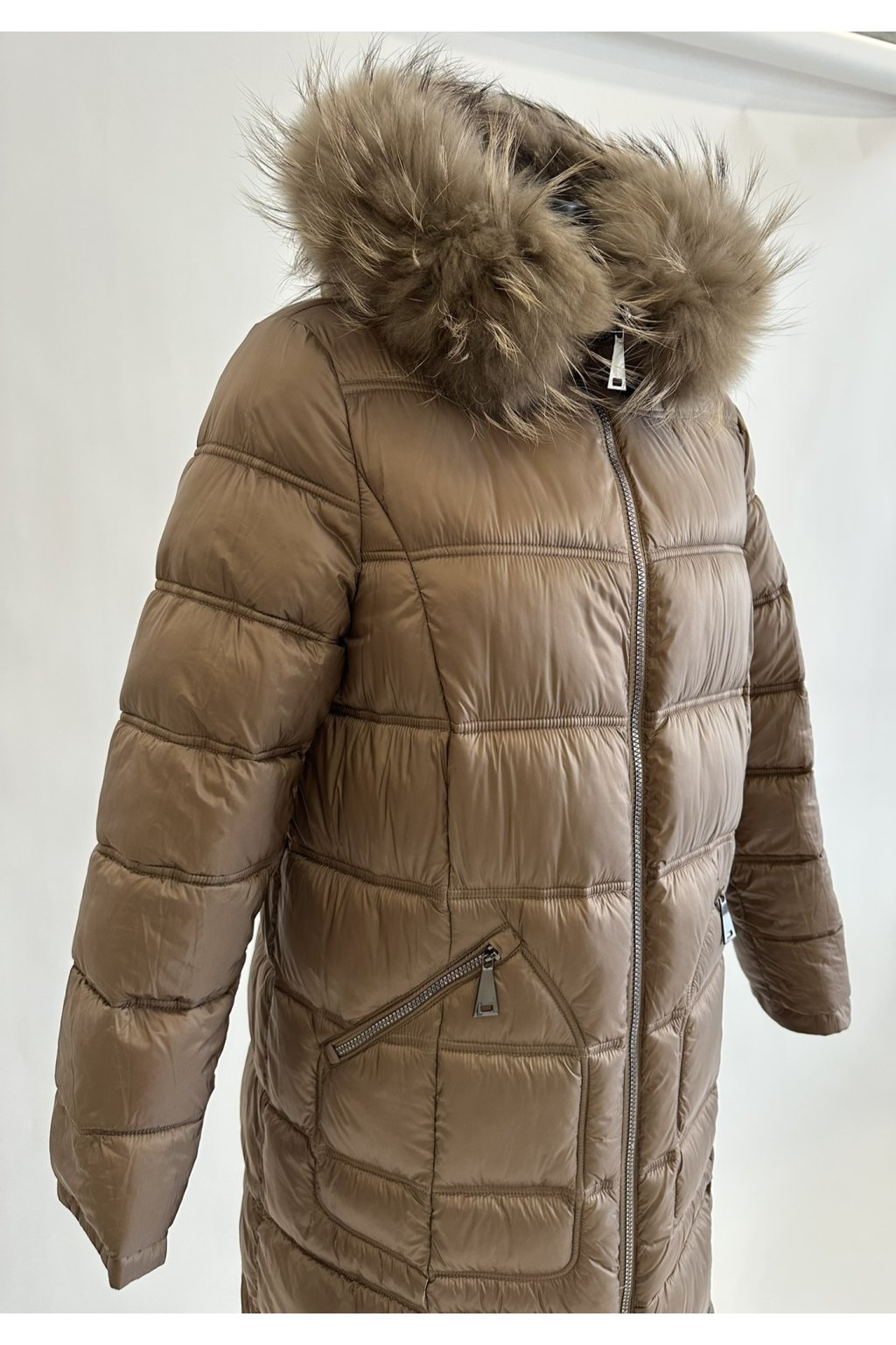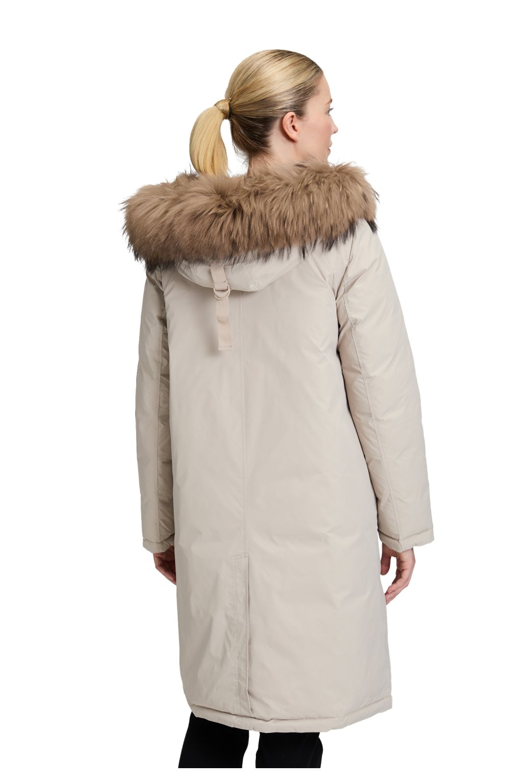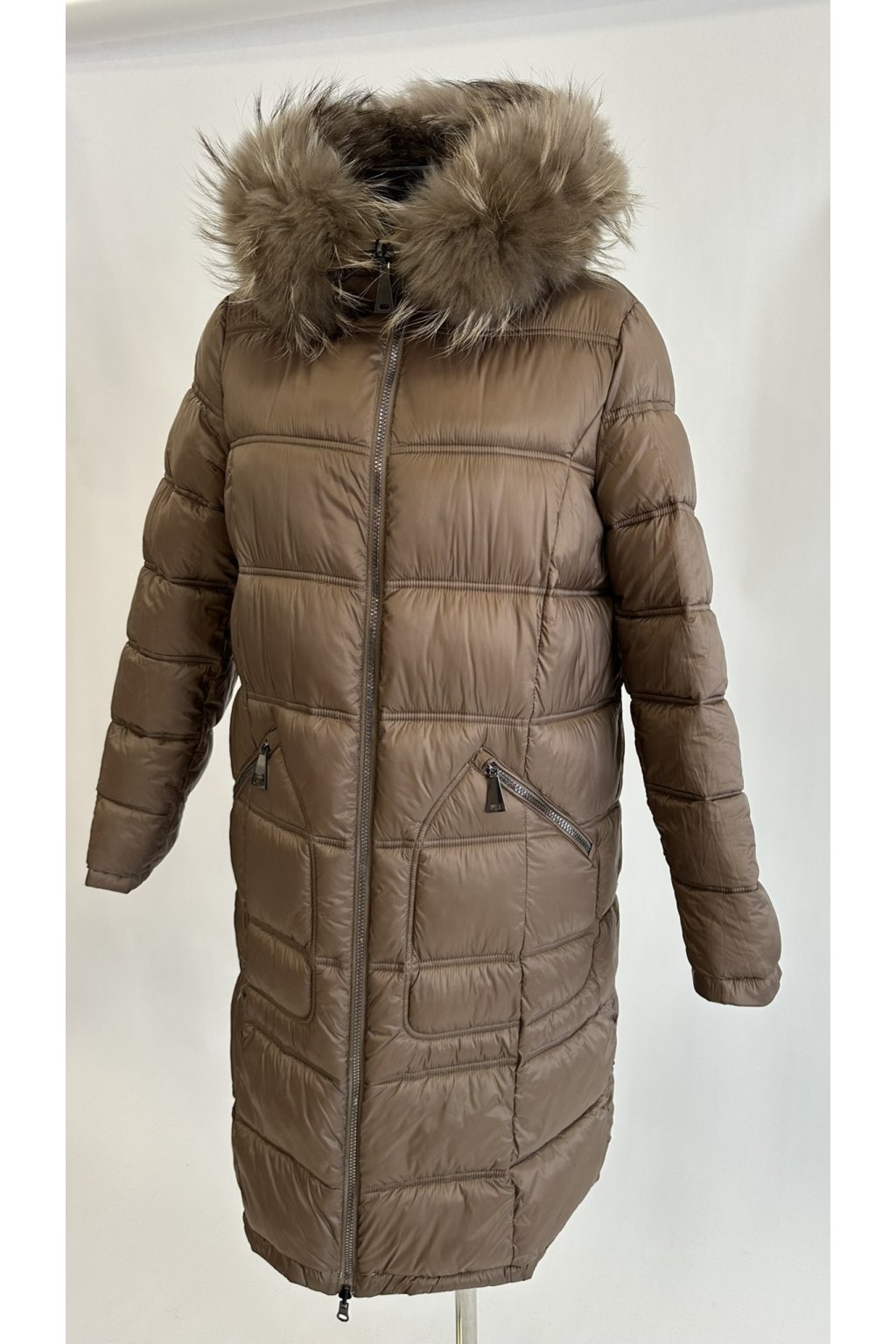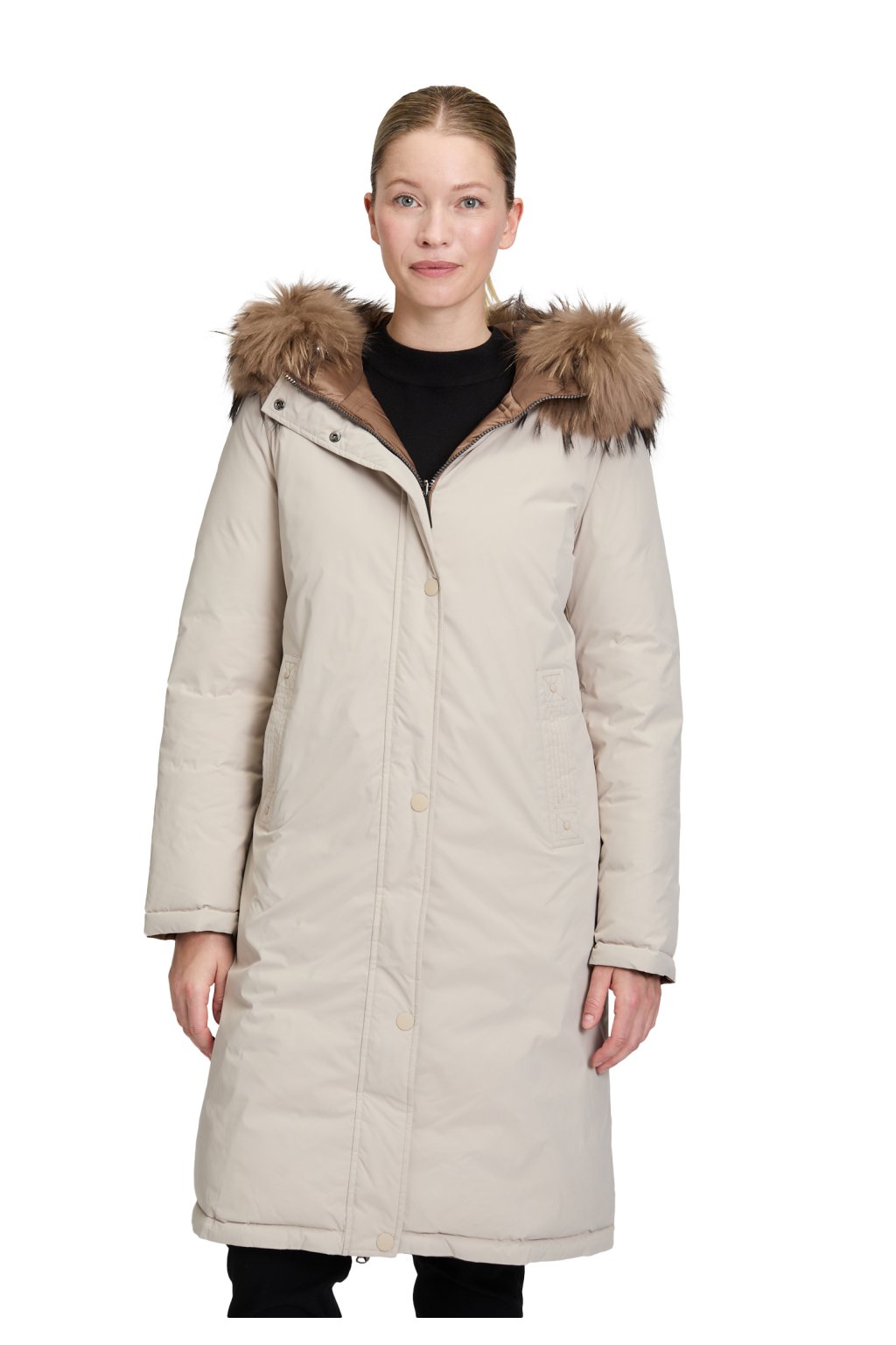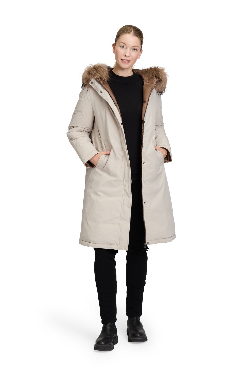 Oboustranný elegantní zimní kabát Betty Barclay v krémové barvě s pravou kožešinou z mývala kolem krku a nastavitelnou šíří kapucí. Kabát má praktický obousměrný zip, klasické všité kapsy. Největší benefit kabátu je možnost nosit ho na dva způsoby, tím, že je kabát oboustranný. Z jedné strany má kabát hladký materiál v krémové barvě a druhá, koňaková strana je prošívaná, takže se hodí k formálním i volnočasovým outfitům.
