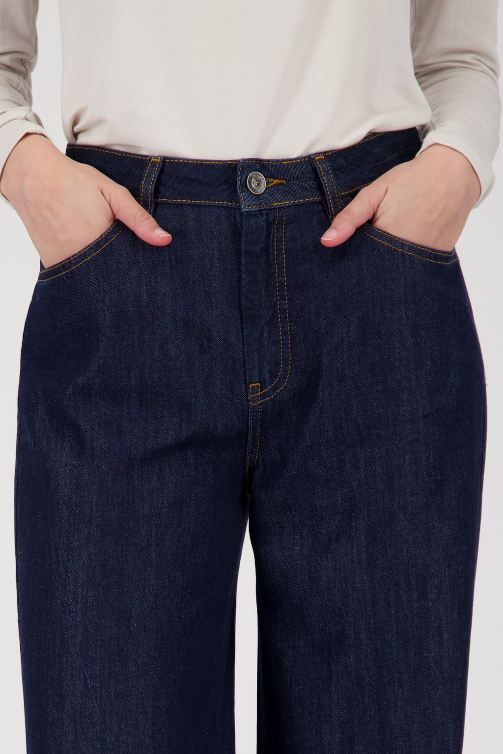 Tmavě modré džíny Monari s vyšším pasem a širokými nohavicemi spojují nadčasový střih s maximálním pohodlím. Kontrastní prošívání dodává elegantní detail, tmavý odstín zase univerzální využití. Skvěle se hodí k blůzce i svetru. Materiál bez elastanu – vybírejte svou běžnou velikost.