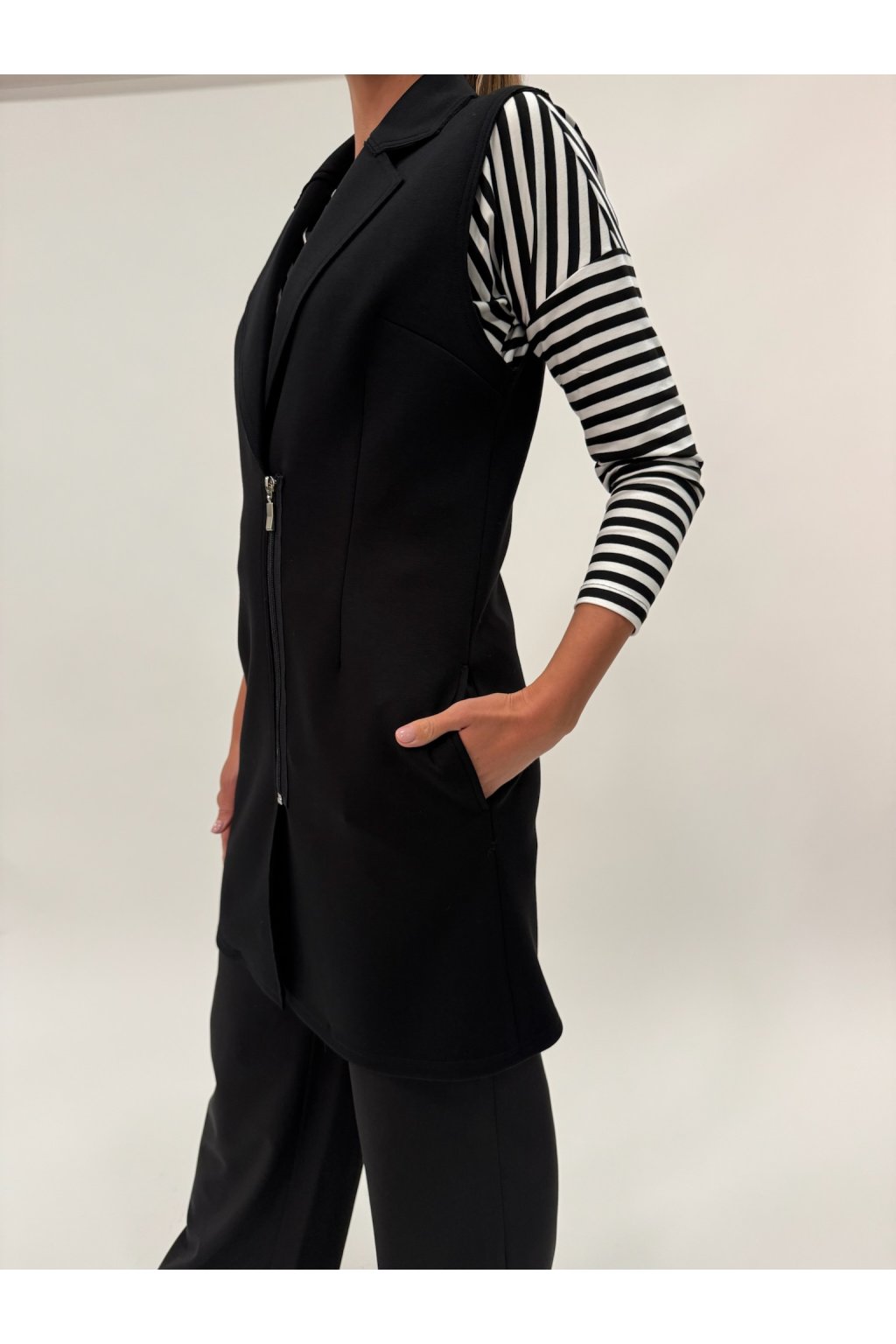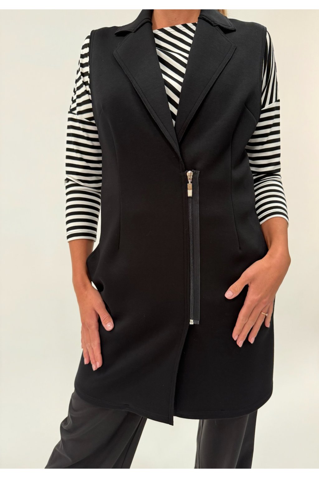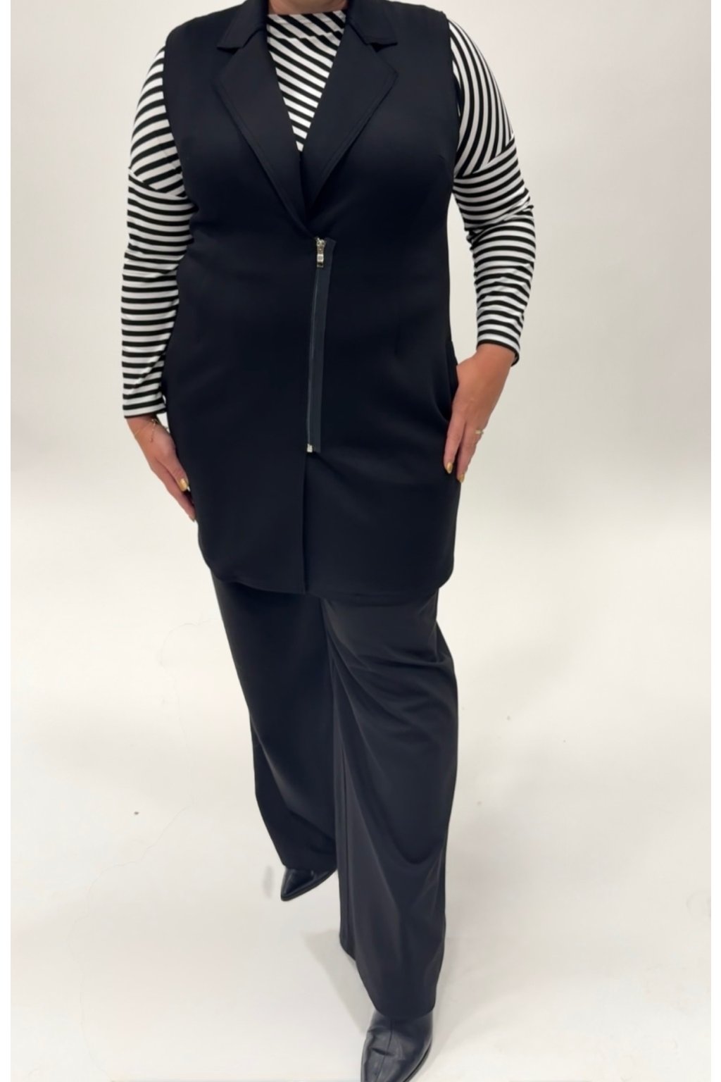 V této elegantní vestě zazáříte! Díky vyššímu podílu viskózy působí luxusně, krásně splývá a je mimořádně příjemná na dotek. Jemný lesk materiálu dodává modelu elegantní business look, který se hodí jak do práce, tak na společenské příležitosti. Vesta má šálový límec, zapínání na dvě patentky a z boku najdete dvě praktické, hluboké kapsy. Tato vesta má zapínání na zip ale dá se kombinovat i s páskem, který krásně zvárazní dámské křivky.