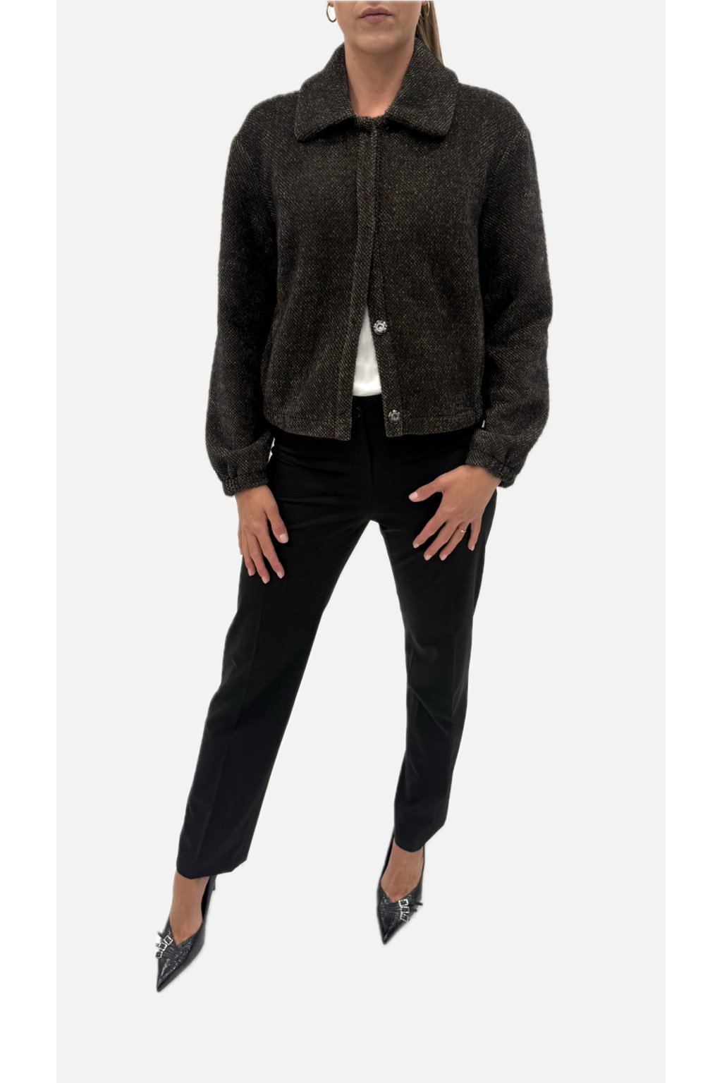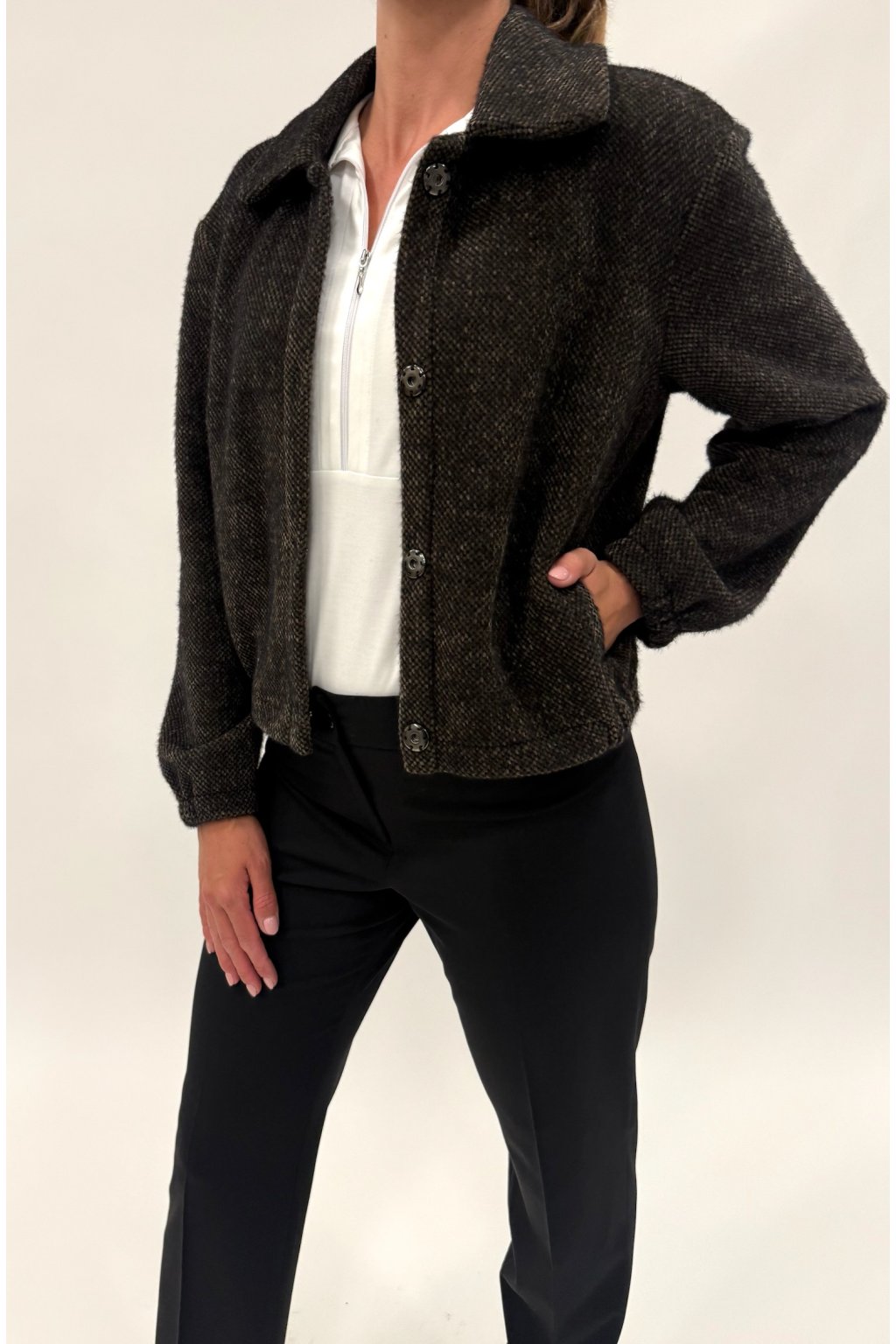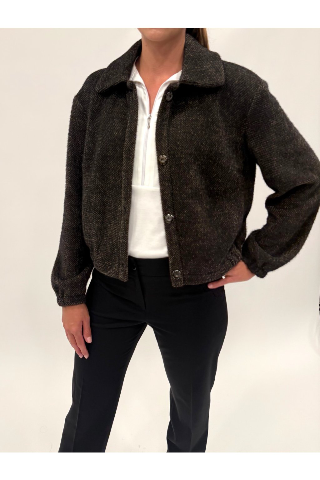 Trendy krátká bunda bez podšívky, která se hodí ke všemu! Je lehká, bez podšívky a ideální pro vrstvení. Má stylový ohnutý límec, zapínání na patentky a praktické kapsy. Rukávy jsou zakončené gumičkou, díky čemuž bunda perfektně sedí a působí mladistvě a svěže. Materiál: 82% Polyester, 18% Polyamid
