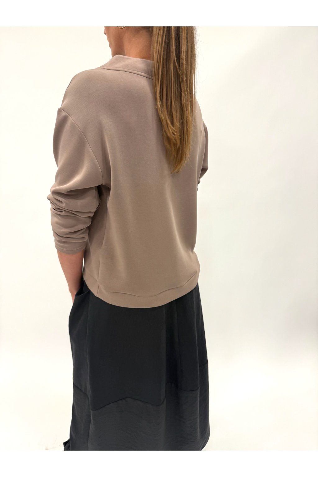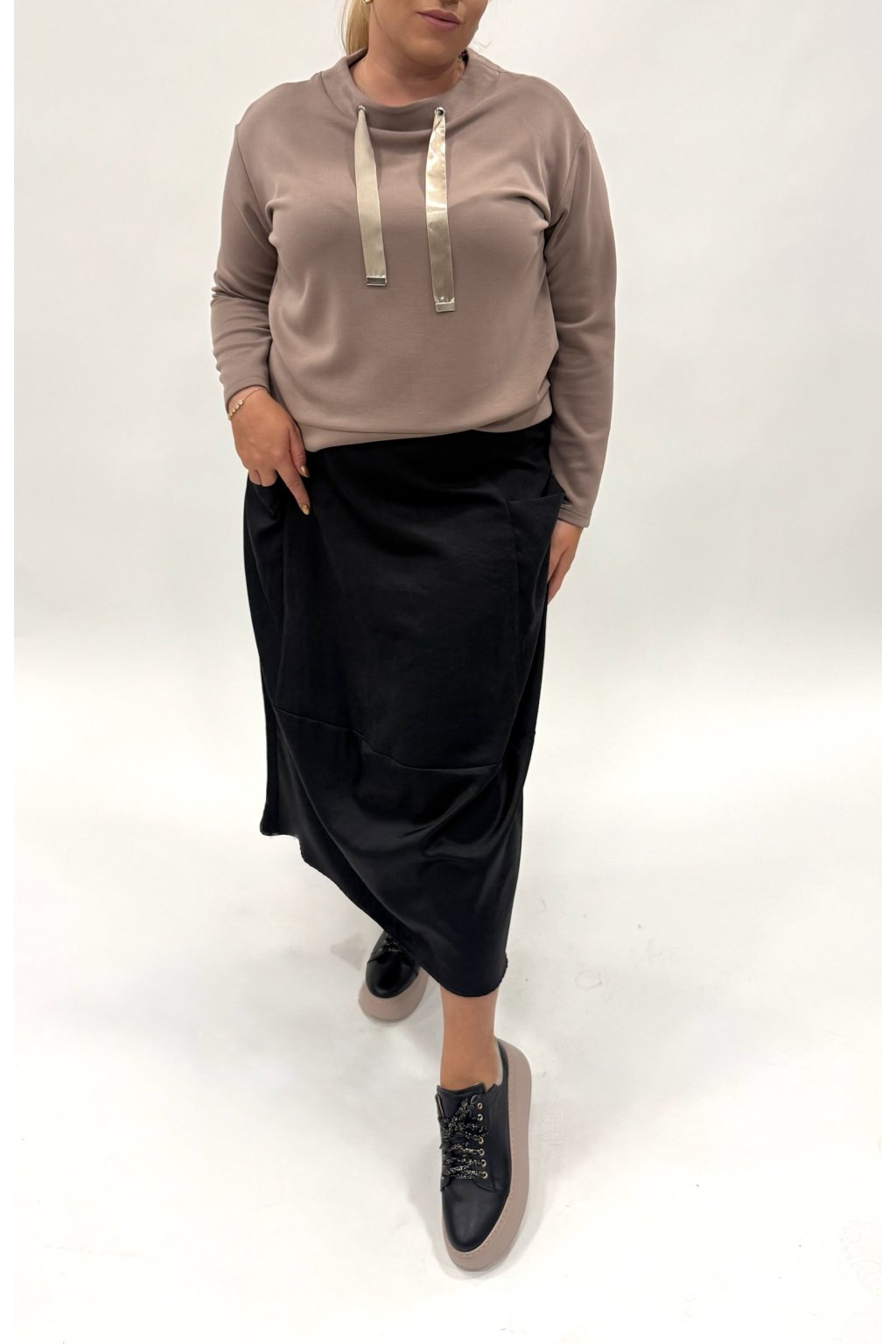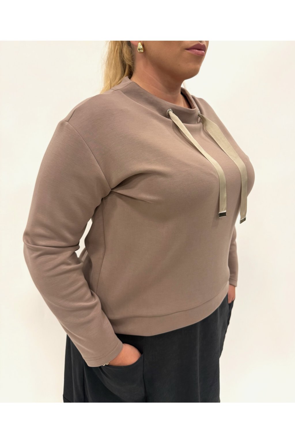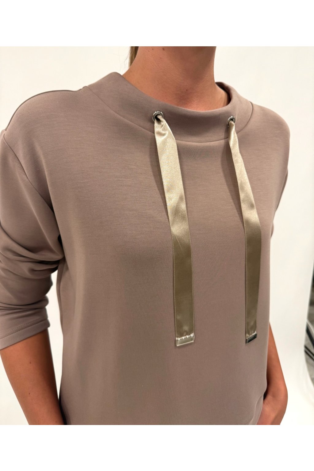 Spojení pohodlí a elegance v jednom kousku! Tato mikina z kvalitní modalové směsi je měkká, pružná, hladká a odolná vůči mačkání i žmolkování. Kulatý výstřih, lehký stojáček a ozdobné šňůrky jí dodávají stylový vzhled. V kombinaci s naší dlouhou sukní s kapsami vytvoříte moderní, ale přesto ženský outfit.