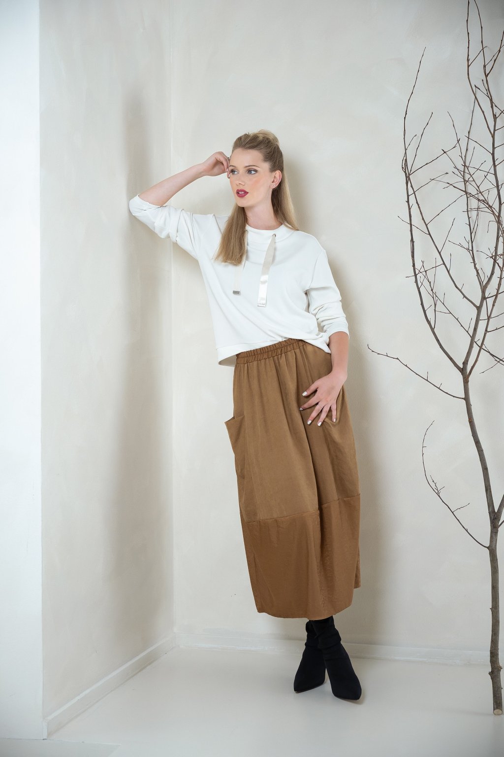 Stylová a pohodlná sukně, kterou si zamilujete! Díky pružné gumě v pase perfektně sedí a krásně se přizpůsobí postavě. Velké, výrazné kapsy dodávají modelu moderní šmrnc a zároveň jsou praktickým detailem. Tato sukně je skvělou volbou jak pro volný čas, tak i do kanceláře – stačí ji zkombinovat s elegantní halenkou nebo mikinou z naší kolekce.