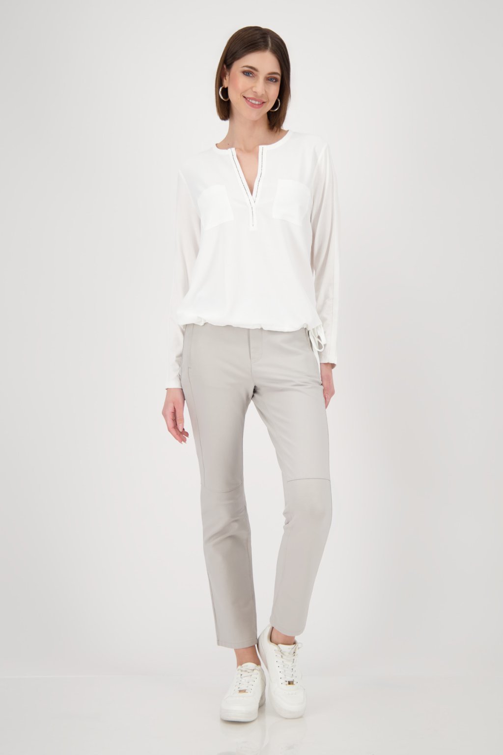 Halenka od Monari vyrobená ze splývavé viskózy kombinuje eleganci a pohodlí. Kulatý výstřih s rozparkem a třpytivými kamínky dodává klasickému střihu elegantní nádech. Nakládané náprsní kapsy, proužek na rukávech a stahovací šňůrka se zavazováním na lemu vytvářejí stylové akcenty. Materiál: 92% Vizkóza, 8% Elastan