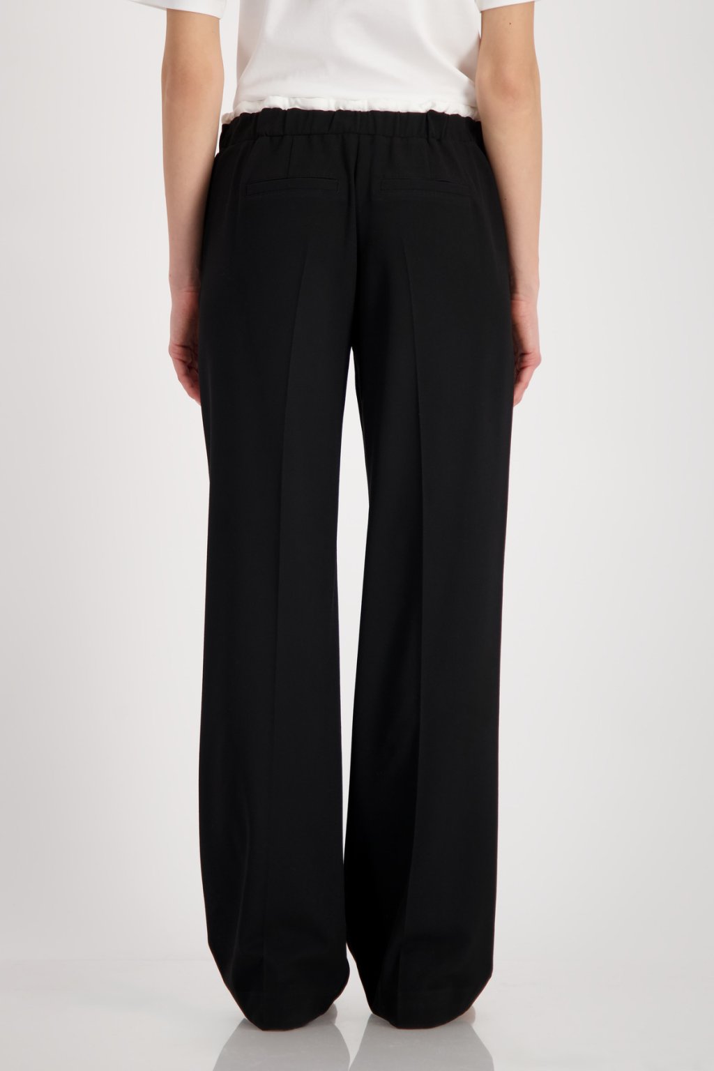 Elegantní rovné Monari kalhoty z rozevláté viskózy s elastickým materiále a kontrastním pasem. Kalhoty mají klasické, praktické boční kapsy a falešné zadní kapsy.