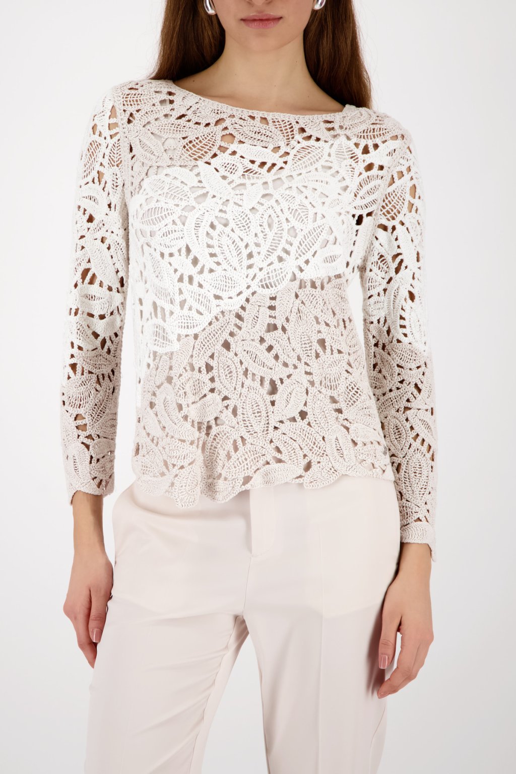 Dámský přízový svetr v bílo-béžové barvě působí jemně, elegantně a přirozeně. Strukturovaná příze vytváří zajímavý vizuální efekt a dodává modelu moderní, lehce luxusní charakter.
