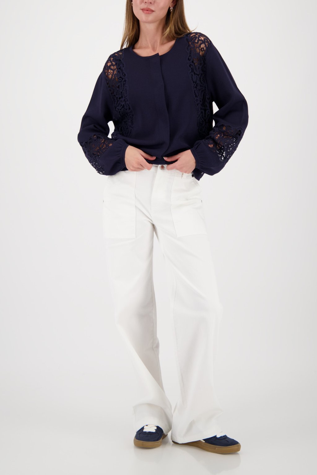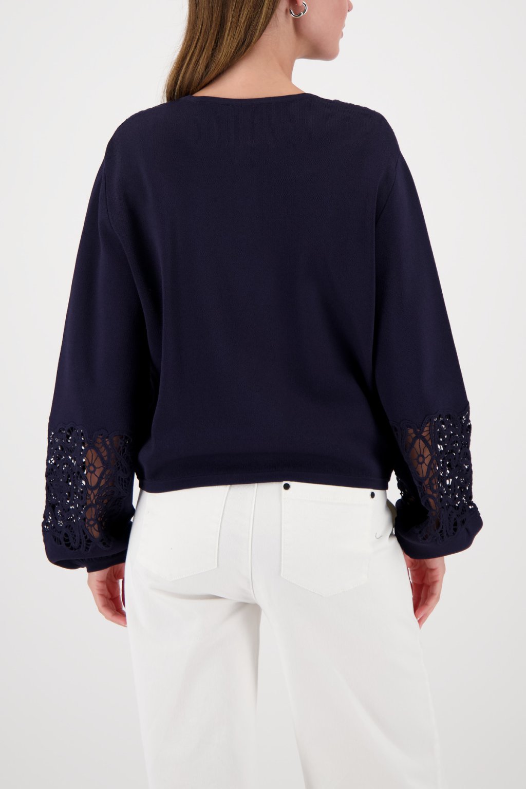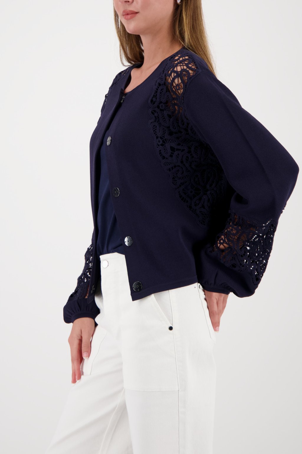 Elegantní propínací svetr z plynoucí viskózy, s decentní krajkou a nařasenými lemy rukávů.