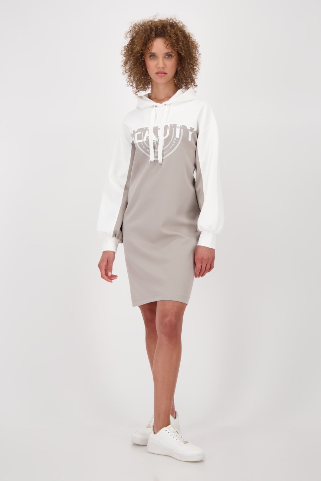 Monari šaty s kapucí jsou vyrobené z viskózy a elastické tkaniny. Nápis "Beauty" s třpytivými kamínky a módní barevné bloky vytvářejí stylové akcenty. Kapuce se zavazovací páskou dokonale završuje sportovní, ženský vzhled - ideálné na volnočasové aktivity i do neformální kanceláře. Materiál: 55% Polyester, 38% Vizkóza, 7% Elastan