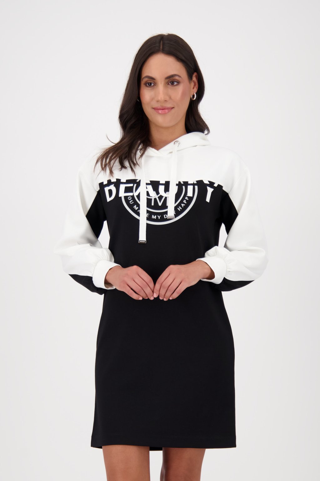 Monari šaty vyrobené ze splývavé viskózy a pružné látky kombinují pohodlí s módním šmrncem. Nápis „Beauty“ s třpytivými kamínky a moderní barevné kombinace dodávají šatům stylové akcenty. Kapuce se zavazováním dokonale doplňuje sportovně-ženský vzhled – ideální pro ležérní a zároveň poutavé outfity.