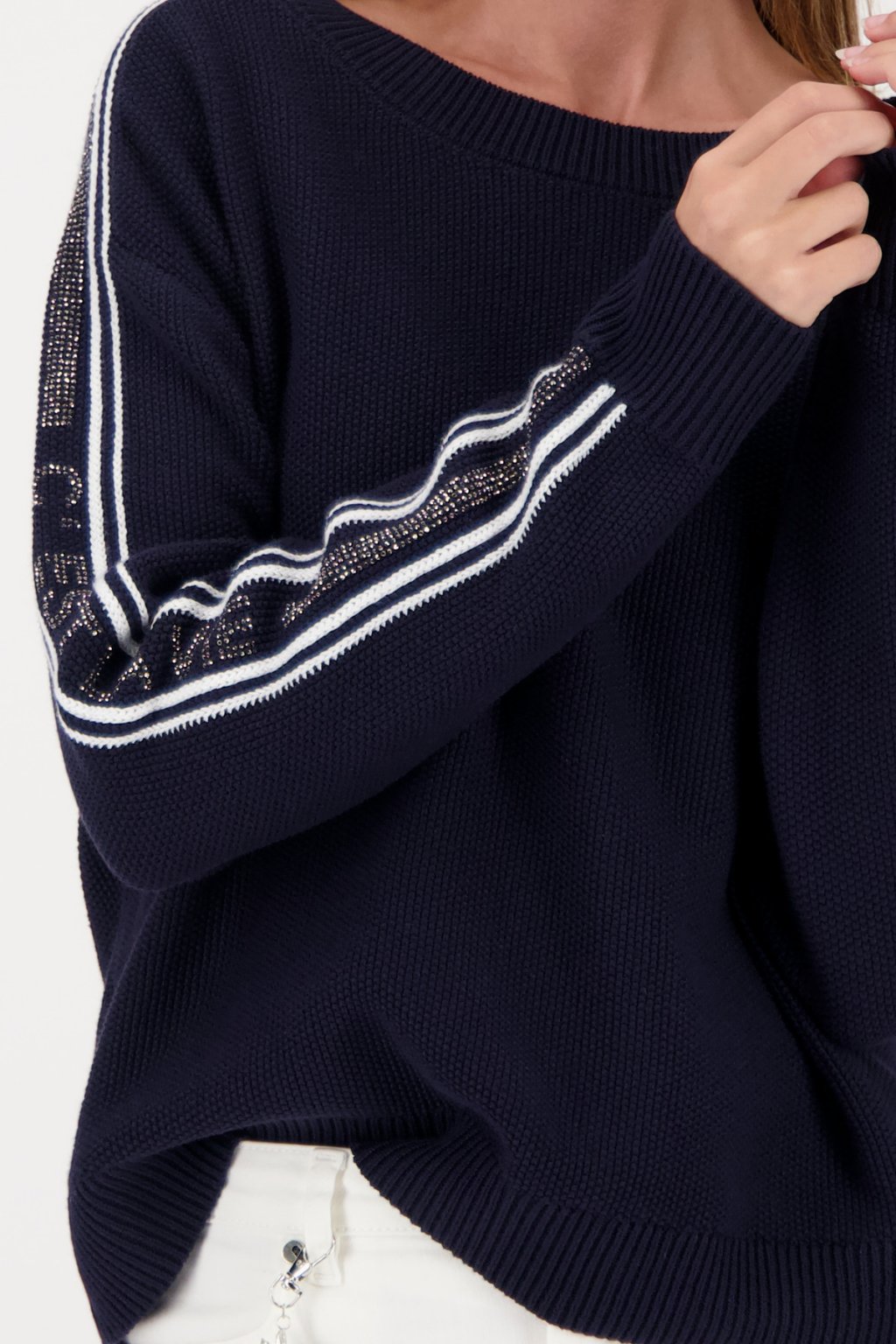 Elegantní pletený svetr ze 100% bavlny zaujme svou jemnou zrnitou strukturou, která mu dodává moderní a sofistikovaný vzhled. Stylové pruhované detaily podtrhují nadčasový design, zatímco třpytivé kamínky na rukávech přidávají jemný, elegantní akcent. Díky kvalitnímu materiálu je svetr příjemný na nošení a vhodný jak pro každodenní outfity, tak i pro elegantnější kombinace.