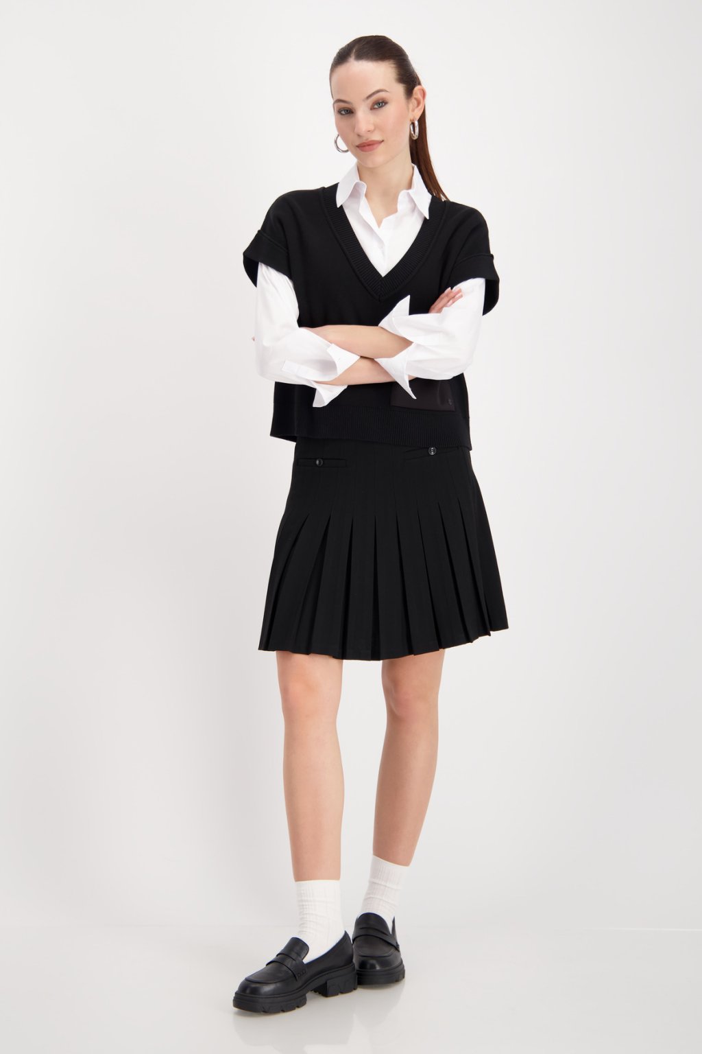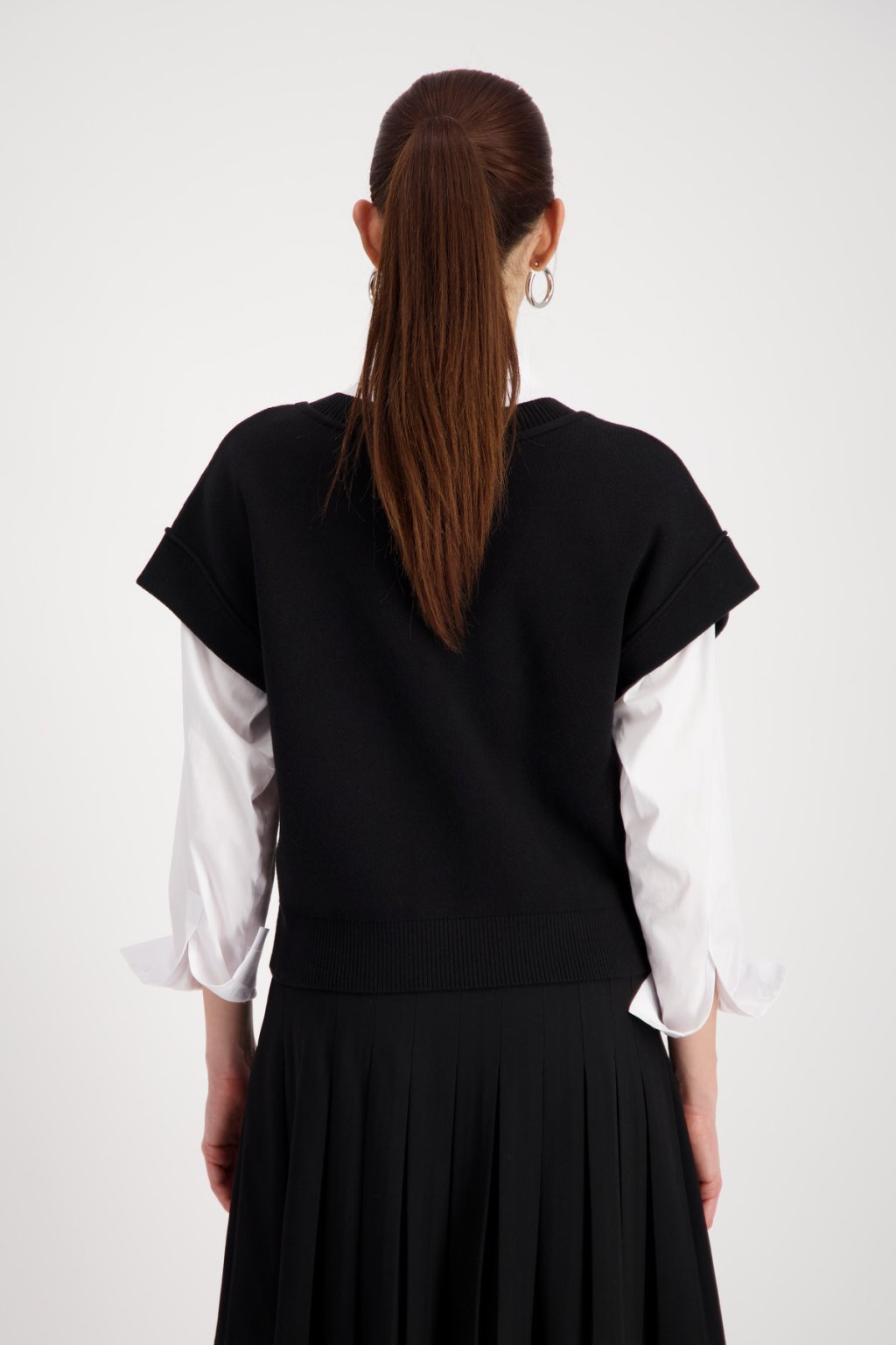 Elegantní Monari pletená svetrová vesta z vysoce kvalitní bavlněné směsi s spuštěnými rameny, výstřihem do V a praktickou klopovou kapsou.
