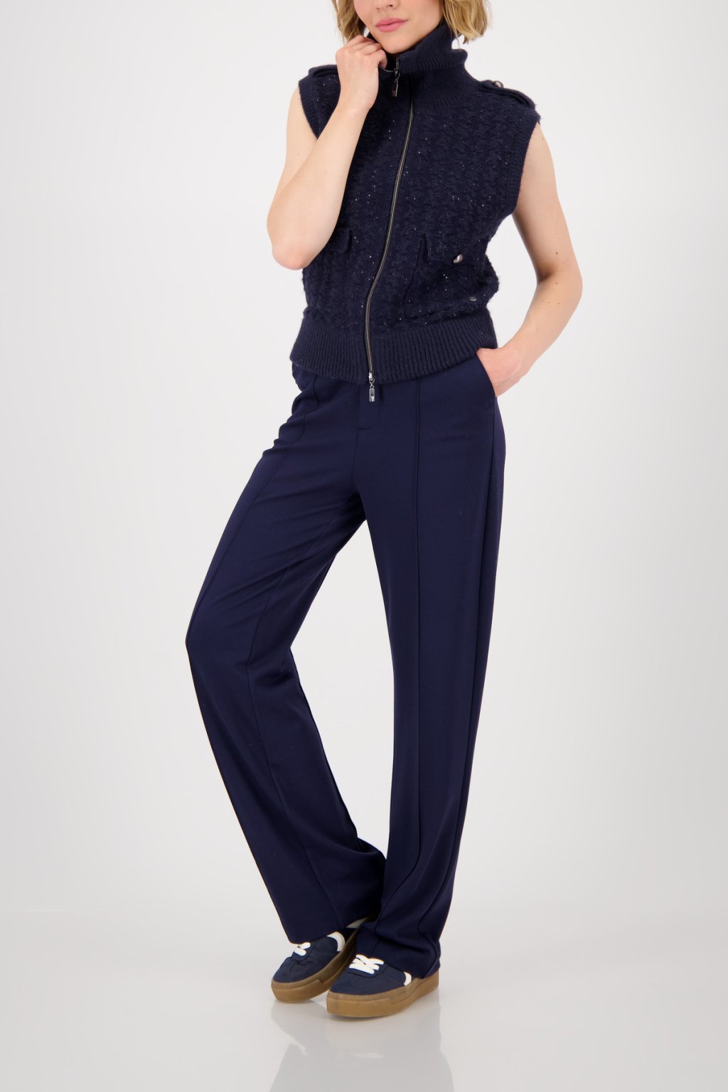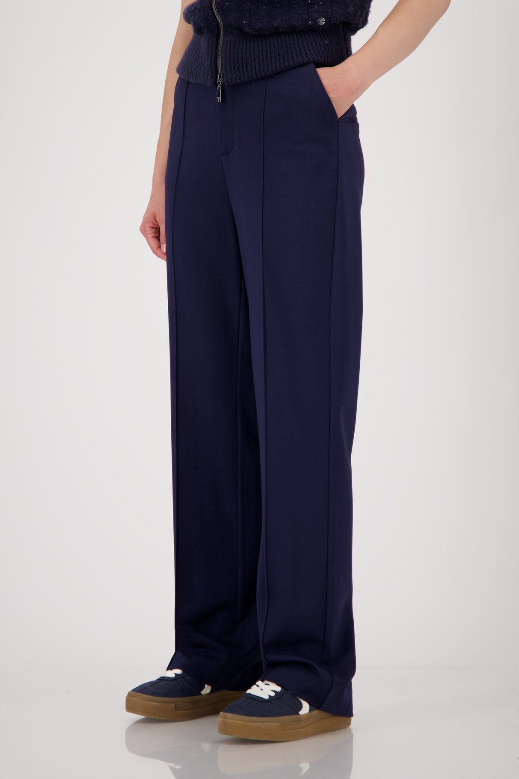 Elegantní kostýmové kalhoty Monari ze splývavé viskózy s nadčasovým rovným střihem. Mají boční kapsy, falešné zadní kapsy a decentní lemování, které podtrhuje čistý vzhled. Díky elastickému materiálu jsou pohodlné a vhodné pro každodenní nošení i formální příležitosti.