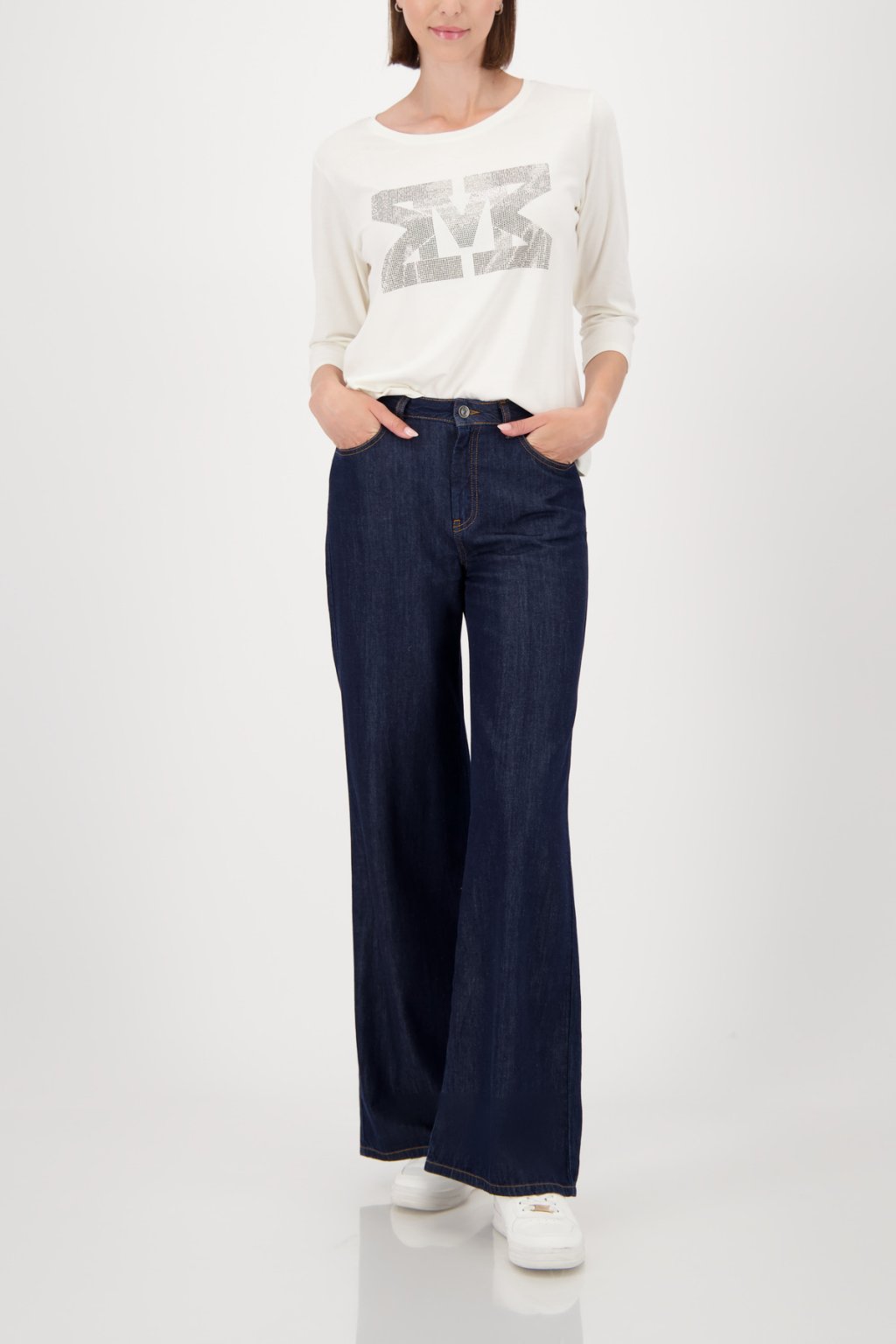 Elegantní tričko Monari z příjemné bavlny s klasickým střihem a 3/4 rukávy. Přední nápis zdobený jemnými kamínky dodává tričku stylový a ženský detail. Díky univerzálnímu střihu se hodí jak k džínám, tak i k elegantním kalhotám.